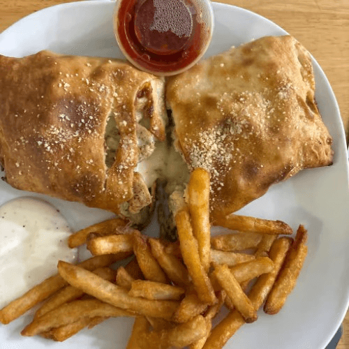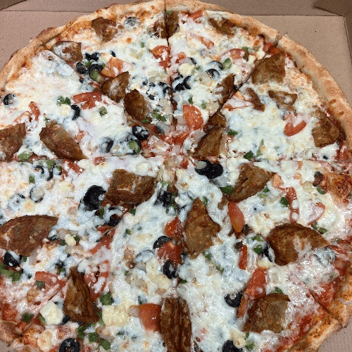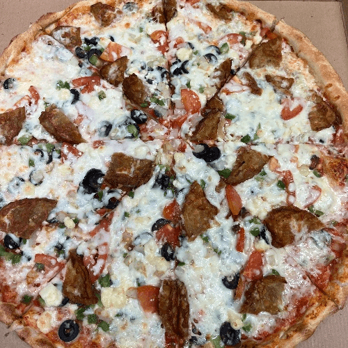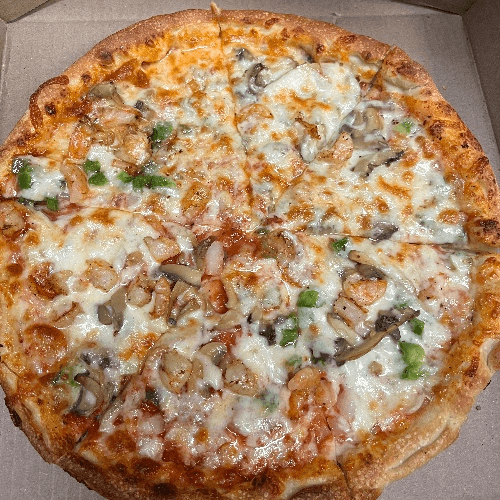Shrimp, onions, mushrooms, green peppers, mozzarella cheese with pizza sauce or alfredo sauce base