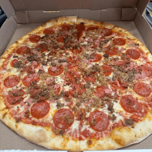 Pepperoni, ham, sausage, ground beef, bacon, and mozzarella