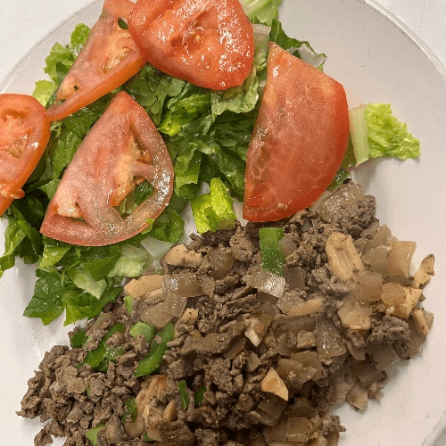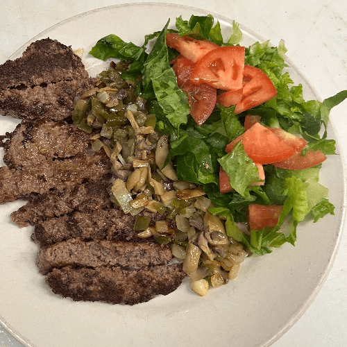 Choice of grilled steak or chicken, onions, mushrooms, and green peppers