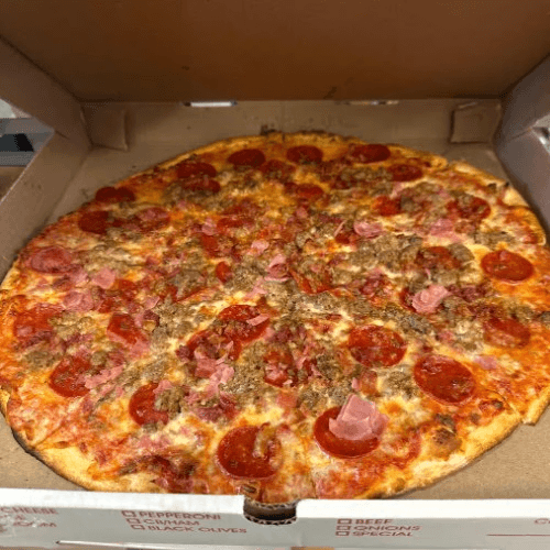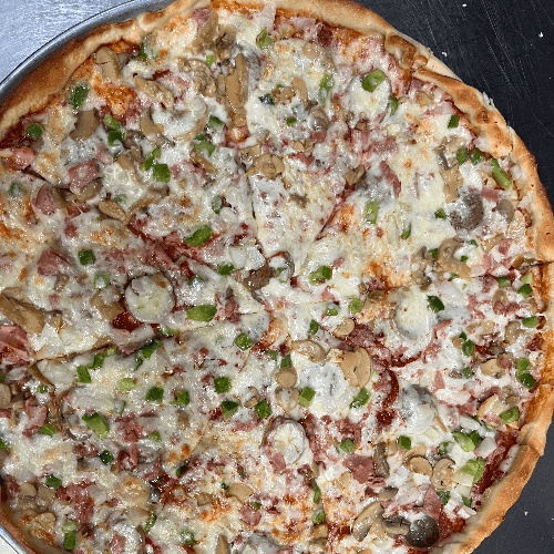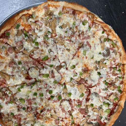 Pepperoni, ham, sausage, ground beef, bacon, green peppers, onions, mushrooms and mozzarella