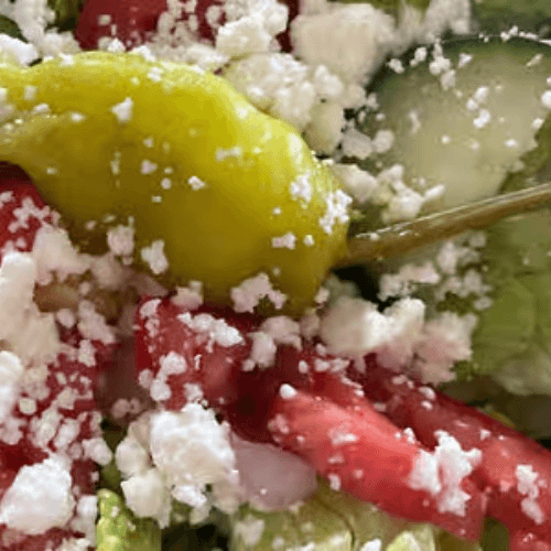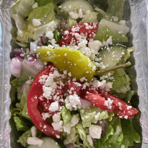 Romaine, tomatoes, red onions, cucumbers, kalamata olives, pepperoncini, and feta cheese