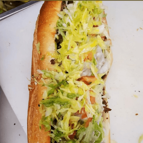 Grilled steak, grilled onions, green peppers, mushrooms with lettuce, tomato, mayo, oil and vinegar