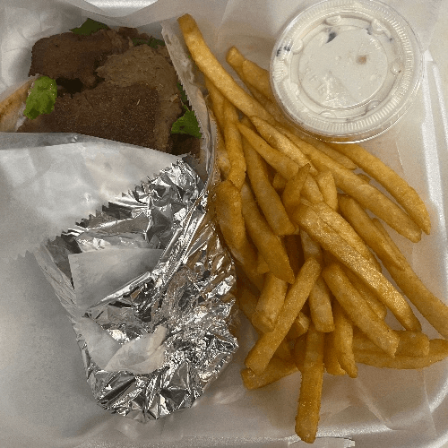 Beef & lamb meat slices, lettuce, tomato, and cucumber sauce